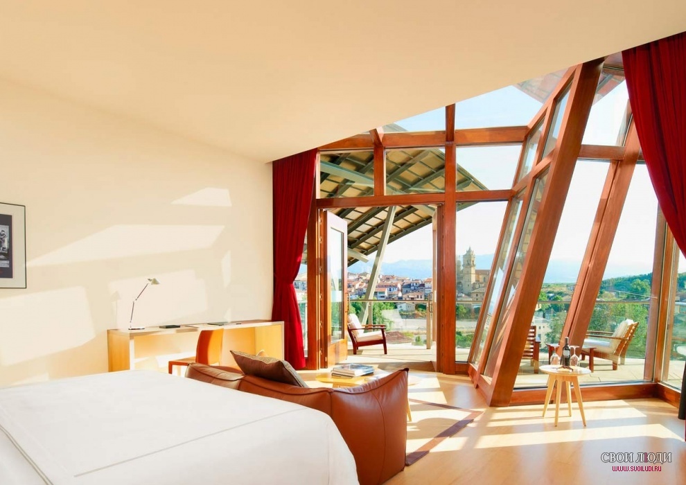 Gehry Suite: роскошный люкс, состоящий из спальни с кроватью king-size, гостиной, просторной ванной комнаты с душевой кабиной и ванной, большой меблированной террасы с прекрасным видом на средневековую деревню Эльсьего и церковь Сан-Андрес. Максимальная вместимость – 3 чел. Площадь номера – 72 кв. м.