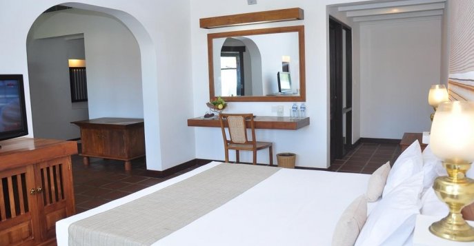 На дивном песчаном пляже известного курорта Берувела в тени изумрудных тропических садов спрятался от суеты и шума роскошный отель Heritance Ayurveda Maha Gedara 4*. Респектабельное заведение изначально специализировалось лишь на обеспечении отличного времяпрепровождения своих постояльцев в изысканных номерах.