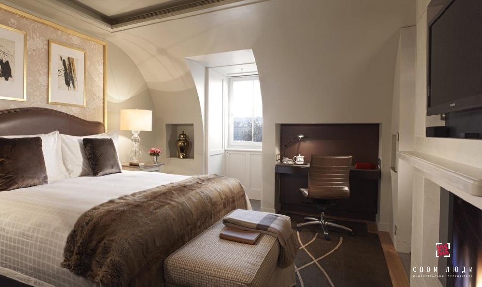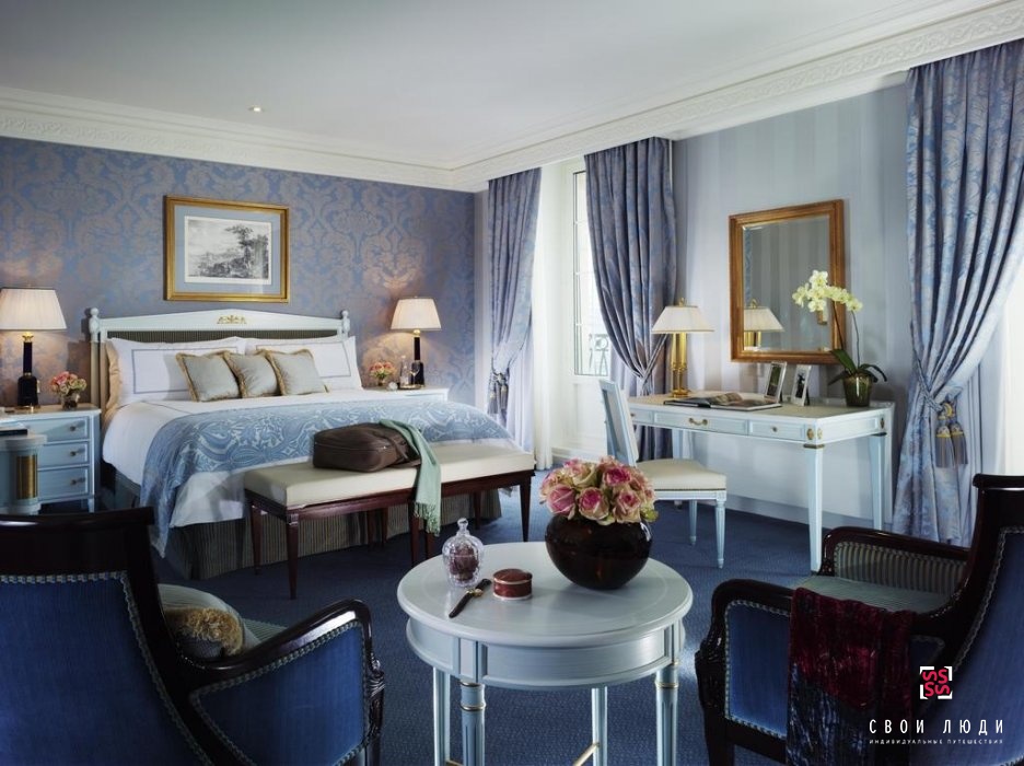 Также на троих рассчитан залитый светом, просторный номер типа Deluxe One-Bedroom Suite. Спальная комната в номерах этого типа также отделена от гостиной, что, впрочем, не мешает наличию уютной зоны для гостей в спальном «регионе». Удовлетворит самый привередливый вкус ванная комната: там имеются в наличии и глубокая ванна, и душевая кабинка, и туалетный столик. Интерьер выдержан в мягких, приятных для глаза пастельных тонах с преобладанием розовых, зеленых или бежевых оттенков; дизайн от Пьера Ива Рошона, как всегда, отличает тяга к классицизму.