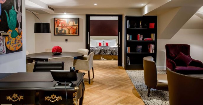 Royal Suite: расположен на верхнем этаже, из окон открывается панорамный вид на город. Площадь – 95 кв.м. Состоит из отдельной гостиной и столовой, просторной спальни с ванной комнатой, гостевого туалета и кухни. Может соединяться с соседним номером, образуя пространство в 120 кв.м. Доступны услуги Business Package.