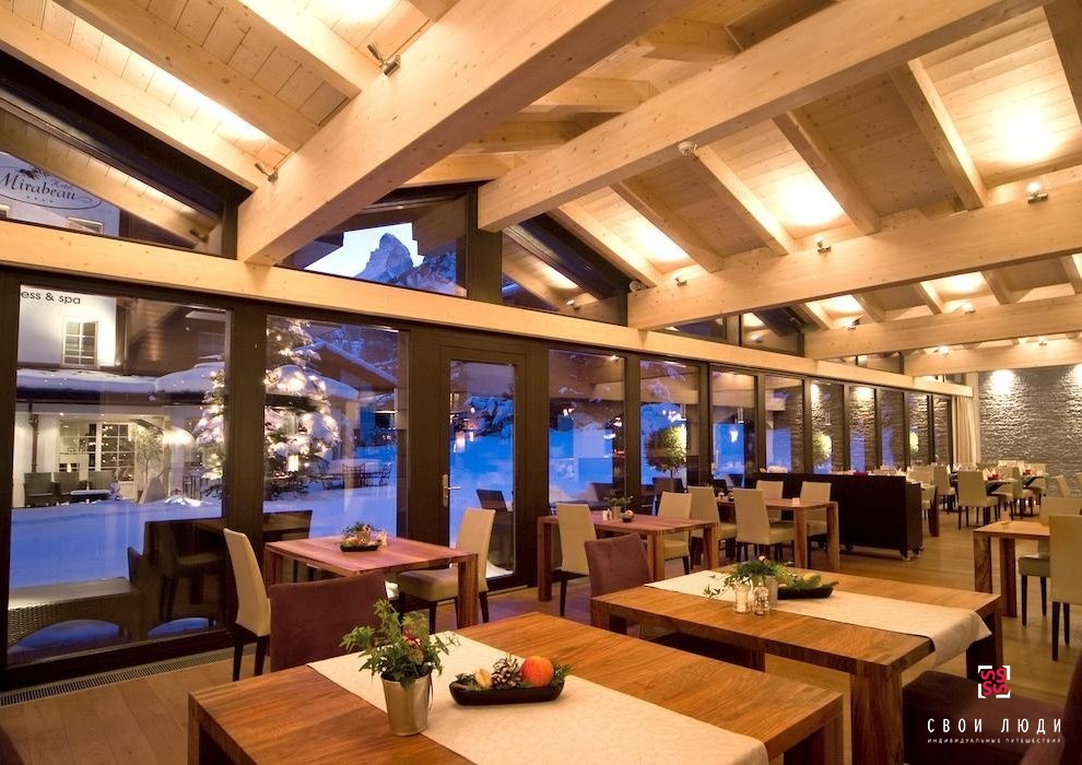 Располагается отель «Mirabeau Hotel & Residence Zermatt» очень удачно, ведь находится он в центре курортного Церматта, а также лишь в 3-4 часах езды от больших аэропортов Милана и Цюриха. Важным преимуществом является питание в отеле, которое включает завтрак за шведским столом и ужин, на который шеф-повар отеля предложит меню, состоящее из 5 вкуснейших блюд на любой вкус.