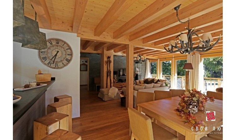 В двухэтажном шале оборудовано 5 спален с собственными ваннами, кухня со столовым уголком с камином и зоной отдыха, несколько балконов и сад.