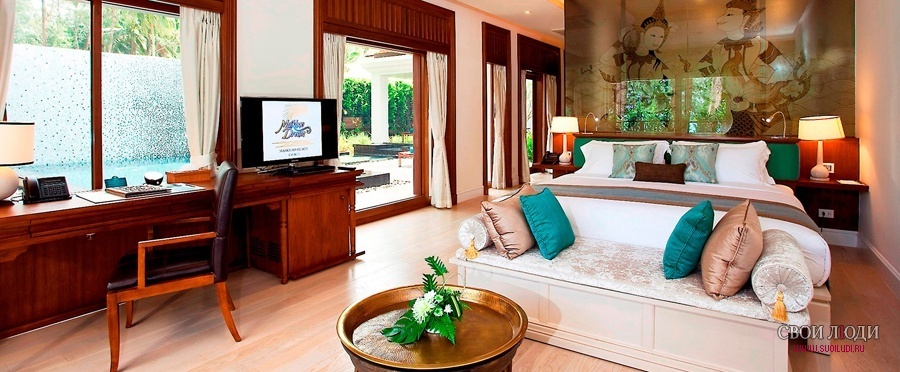 3 Bedroom Double Pool Villa: трехкомнатные виллы с двумя бассейнами площадью650 кв. м обставлены элегантной тайской мебелью, отделанной натуральным шелком. Стены двухэтажного особняка украшены ручной росписью, на второй этаж ведет мраморная лестница. Вилла состоит из трех спален, просторной гостиной, оборудованной всем необходимым кухней, двух уютных столовых, бара, солнечной деревянной террасы на крыше (там же находится третий бассейн, наполненный морской водой), нескольких ванных комнат и удобного гардероба. Из окон и с террасы открываются отличные виды на побережье Андаманского моря.