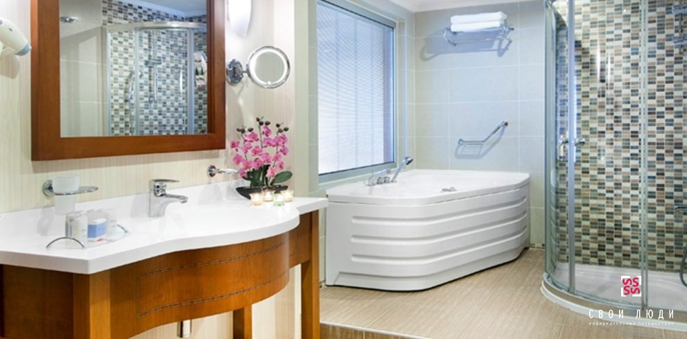Для детей обустроены специальный бассейн с водными горками и игровая площадка в саду.