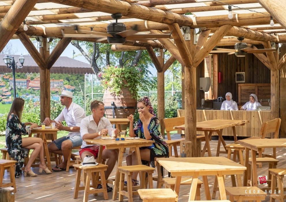 В главном ресторане: завтрак "шведский стол", обед и ужин, поздний завтрак, диетический буфет, детский буфет (для детского питания есть блендер, микроволновая печь, подогреватель бутылочек), послеобеденные закуски, мороженое (1 час в день), время чая и кофе и печенья, блины в палатке Йорук, гамбургеры/хот-доги на берегу моря, полуночный буфет. Напитки подаются к столу в ресторанах и барах.
