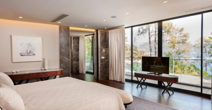 На вилле: 5 спальных комнат, 1 гостиная, шторы на электрокарнизах, кухня, 5 ванных комнат, минибар, холодильник с безалкогольными напитками, кондиционер, электронный сейф, утюг и гладильная доска. А также мраморное напольное покрытие, терраса, отдельная зона для принятия солнечных ванн, балкон, отдельный бассейн, джакузи, сауна, ванная комната, душевая кабина, туалет, макияжное зеркало и фен, банные принадлежности, банный халат, тапочки, весы, 6 Led TV, спутниковое вещание, музыкальный канал, высокоскоростной доступ в интернет, прямой телефон.