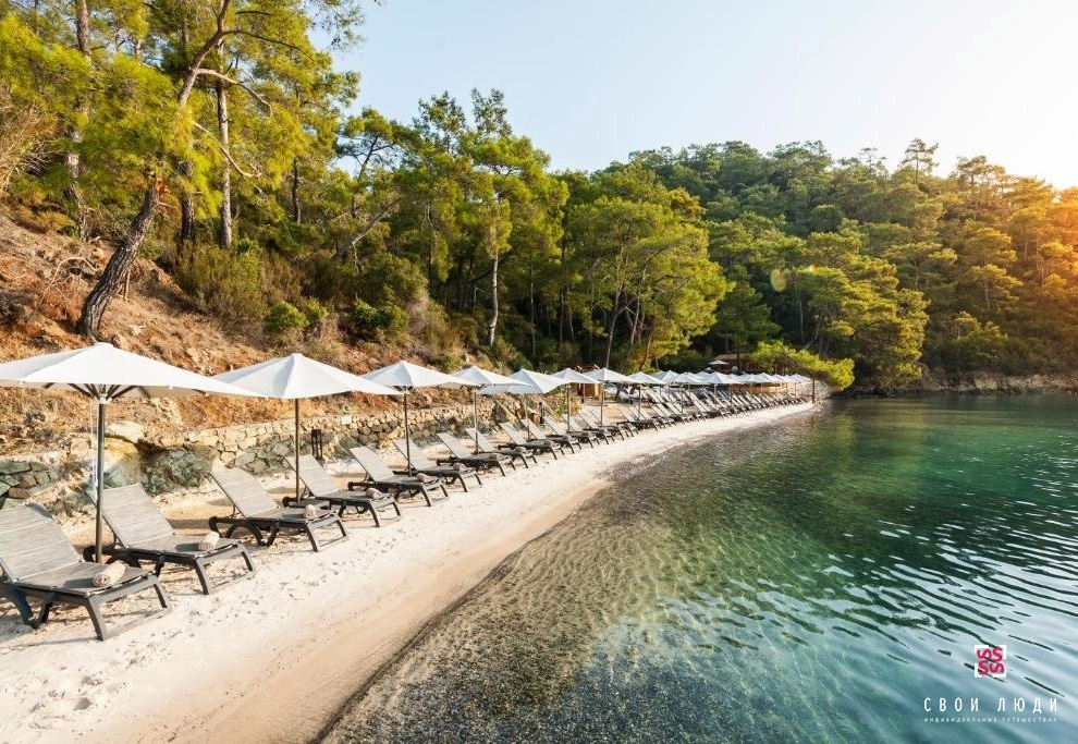 Отель находится на первой береговой линии, в 100 м расположен песчано-галечный частный пляж. Пляжные полотенца, мягкие шезлонги и зонтики от солнца - бесплатно. На пляж в течение дня предоставляется бесплатный трансфер на катере (5-7 минут езды). Rixos Premium принимает гостей старше 13 лет.