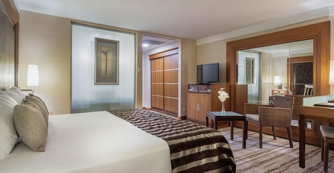 Номер расположен в зоне «Deluxe Villas & Suites». Общая площадь 51 кв.м. Из номера открывается завораживающий вид на море или парковую территорию отеля. В номере к услугам постояльцев предлагается: гостиная, спальня с джакузи и вращающаяся кровать, ванная комната, телевизор и кондиционер, сейф, на балконе установлена джакузи.