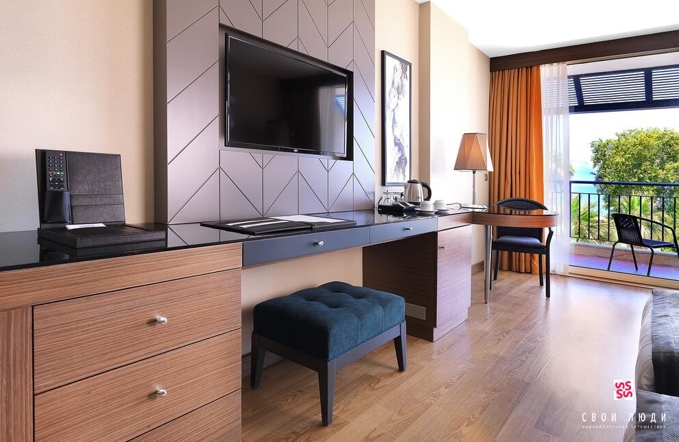 В ванной комнате есть душ/ванная, фен, набор индивидуальных средств личной гигиены. В меблировку однокомнатного номера входят: одно-/двуспальные кровати, стол, стулья, шкаф для одежды, электрочайник с набором для чая/кофе. Двухкомнатные номера имеют отдельные спальную, гостиную с мягкой мебелью, кухонный уголок.