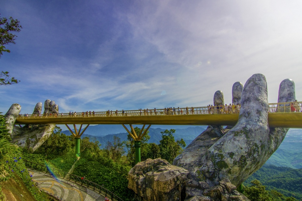 Подъём по канатной дороге, занесённой в Книгу рекордов, с захватывающими панорамными видами гор с высоты. По прибытии на станцию Марсель гости посещают Золотой мост — знаковую пешеходную конструкцию, поддерживаемую гигантскими каменными руками среди облаков.